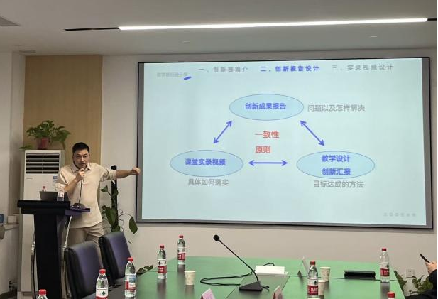 分享会上,王浩宇老师从个人成长经历出发,系统介绍了教师教学创新大赛的赛事特点与参赛价值。在经验分享环节,他详细剖析了备赛过程中的关键环节与核心要点,着重对教学创新报告的设计撰写与课堂实录视频的制作展示进行了深入讲解。针对创新报告,王老师从选题立意、创新点凝练、理论依据、内容架构、实施路径到成效评价,层层递进,分享了如何撰写一份逻辑清晰、特色鲜明、支撑有力的高质量报告。在实录视频方面,他结合具体案例,展示了如何通过精心的教学设计、生动的课堂互动、现代化的教学手段以及精准的镜头语言,真实、生动地呈现课堂教学的创新实践与良好效果,并提供了宝贵的拍摄制作建议。